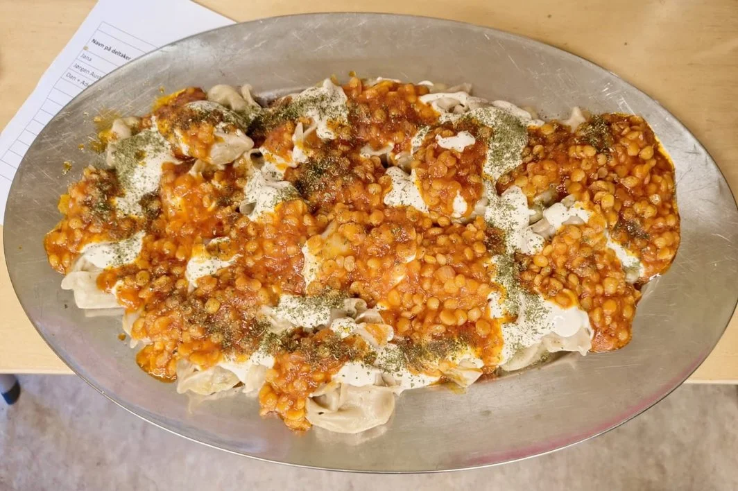 Afghansk mantu med yoghurt og kikerter saus.
