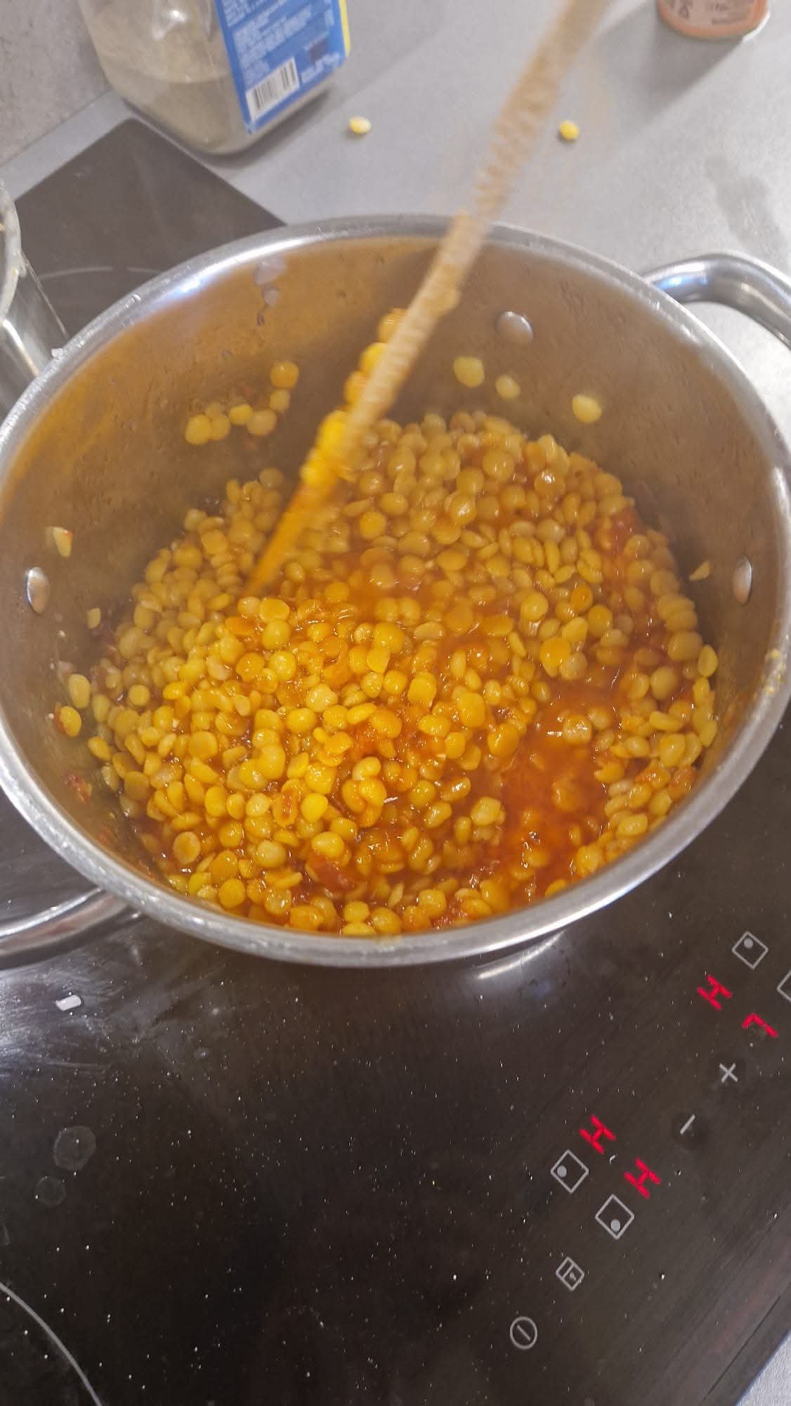 Tilsett kikerter tilbake i blandingen, tilsett varmt vann til det dekker kikertene, tilpass saltet etter smak.